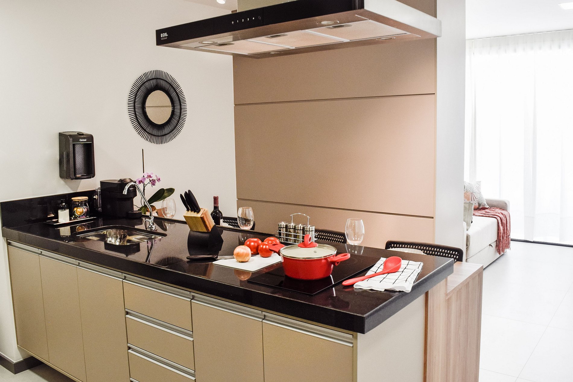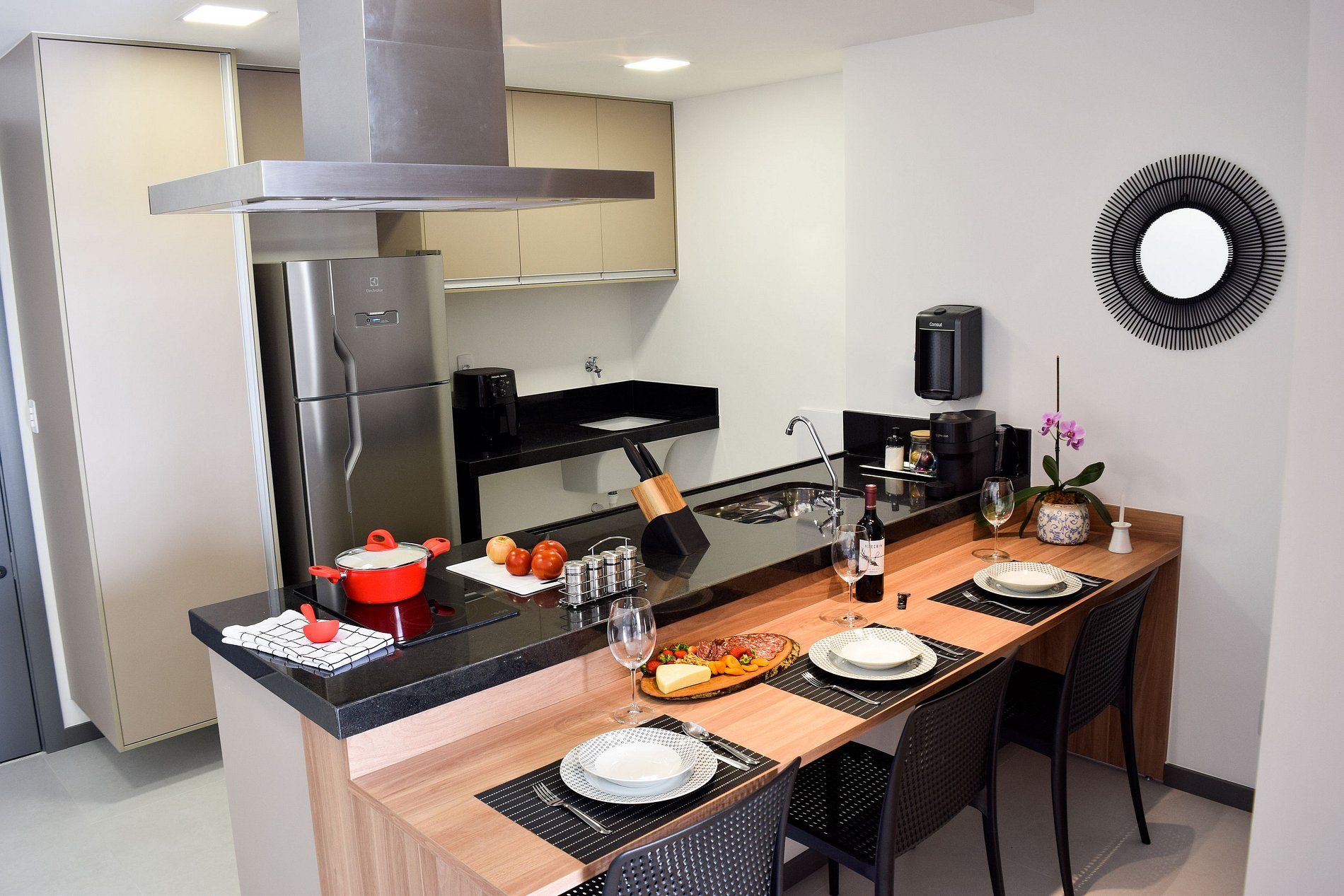 A cozinha está equipada com tudo o que você precisa: geladeira, liquidificador, Airfryer, sanduicheira, fogão e utensílios para preparar refeições no dia a dia. Além das comodidades exclusivas do apartamento, o hóspede pode desfrutar das áreas comuns do condomínio, incluindo academia completa, coworking e um moderno espaço gourmet, garantindo uma experiência ainda mais completa.
